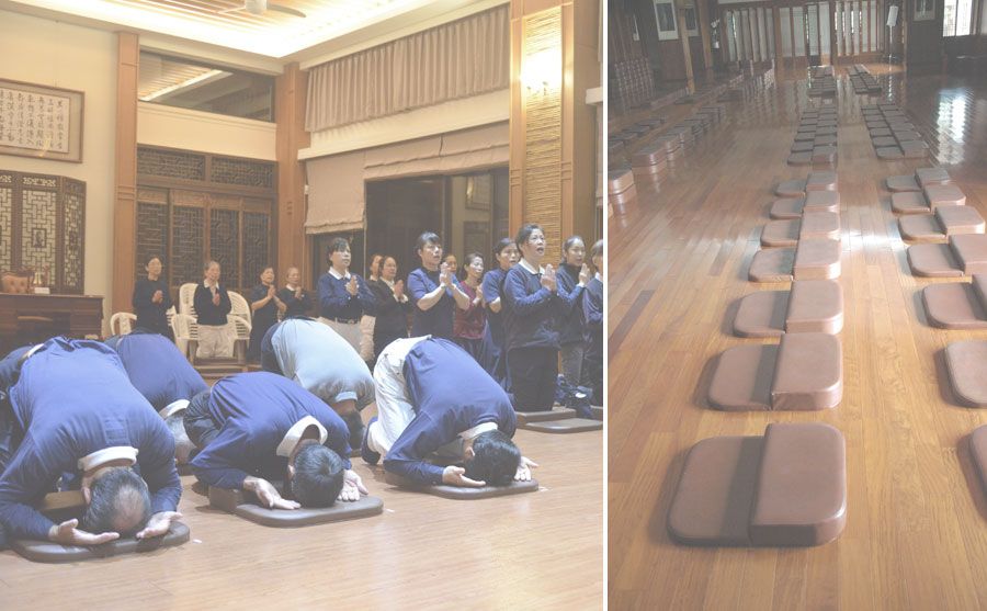 敲板聲響,眾人隨著引磬高聲唱誦楊枝淨水讚「楊枝淨水遍灑三千.性空八德利人天.福壽廣增延.滅罪消衍.火焰化紅蓮…」東西班隨經文五體投地,用最虔誠的心向觀世音菩薩祈禱祝福。