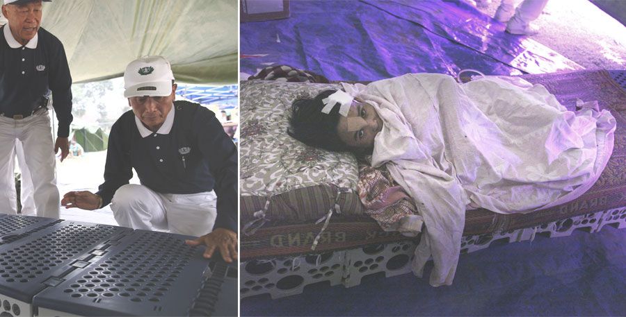 這個像手提包的東西,就是「福慧床」,輕巧方便攜帶,打開之後,變成一張堅固耐用的床。慈濟賑災醫療團員:「我中間一壓變成兩張靠背的椅子,這個又可以散熱,不會像鐵板這麼硬。」可做「病床」,又可當成「候診椅子」,「福慧床」功用多多。
