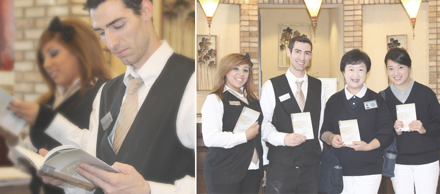 志工致贈《靜思語》書籍予加州鑽石吧市( Diamond Bar )旅館業者並歡喜合影。感恩 Clarissa 女士、Brandon 先生、潘彥蓉師姊 (慈韵)、洪儀珈師姊、Clarissa Brandon、潘彥蓉 (慈韵)、 洪儀珈。