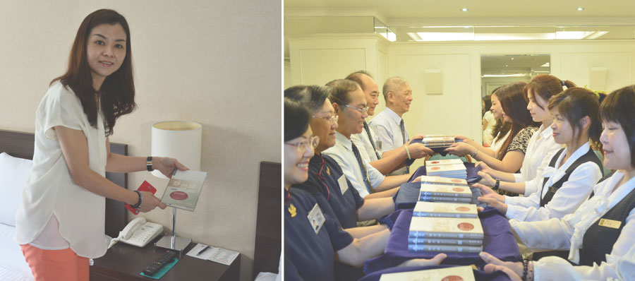 飯店開啟了一道善門,讓《靜思語》送入飯店,一本本的心靈良伴,擺放在每間客房,成為更多人的床頭好書。在喧鬧的城市中,感受更深層的淨心之旅,傳遞美善的祝福,帶動愛的 循環,飯店裡薰起人文香,讓好話傳萬里。