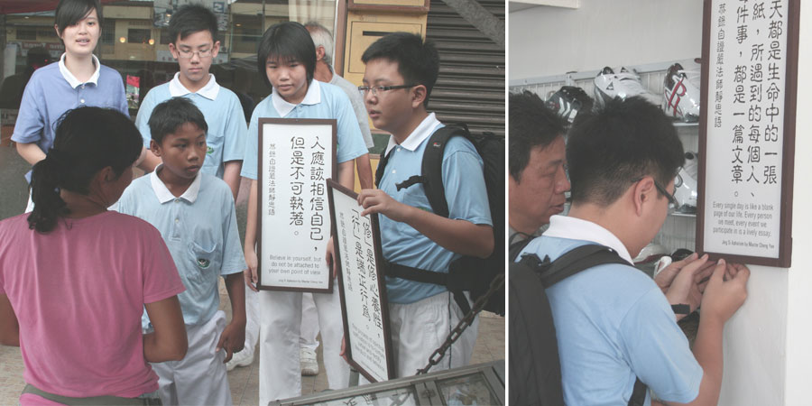 書局老闆貼心的先把自家玻璃擦拭乾淨,再讓孩子把靜思語貼上,並肯定這些孩子的懂事;麵攤老闆則希望可以在店內、門口各貼一張,這些孩子當然樂此不疲;水果攤老闆娘則很有智慧的將靜思語貼在收銀機右上方,她說: 「貼在那裡,不只我可以時時看見這句好話,客人付錢時也會看見。」