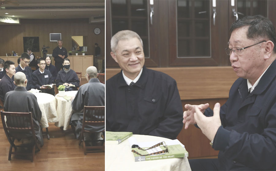 負責導讀的德澍師父首先在白板上寫下兩則討論主題,再請讀書會成員翻開書本第四章。導讀中提到,「世界上有很多的天災、人禍都是人所造成的。我們應該學會反省自己,為什麼會彼此的對立,引起戰爭,做出傷害天地的事情。」