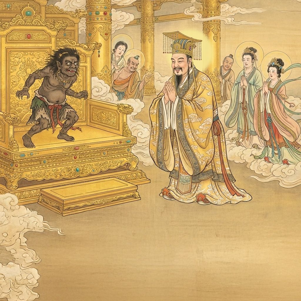 其中有一隻,當人家在大殿開始拜佛時,牠就會跳到大殿門外非常虔誠的祈禱,希望佛陀能賜給牠兩足站立的能力,可以像人類一樣以雙腳來走路。由於牠的虔誠,所以感動了一位天神,於是就滿了牠的心願。牠覺得很歡喜,因為所有的蟾蜍都必須四腳跳躍,只有牠能兩足站立而行,所以牠覺得很高興也很驕傲。