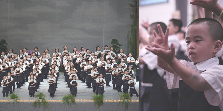 其中,小志工黎宏恩參加經藏演繹,是想藉由手語與人溝通,讓他們了解經文的意思,幫師公上人傳法。可以在臺上演繹手語給很多人看,很開心。他平常都有在存竹筒,想把錢捐給需要幫助的人,很期待可以在書軒當小志工,可以招呼客人的時候,同時可以勸人家吃素。