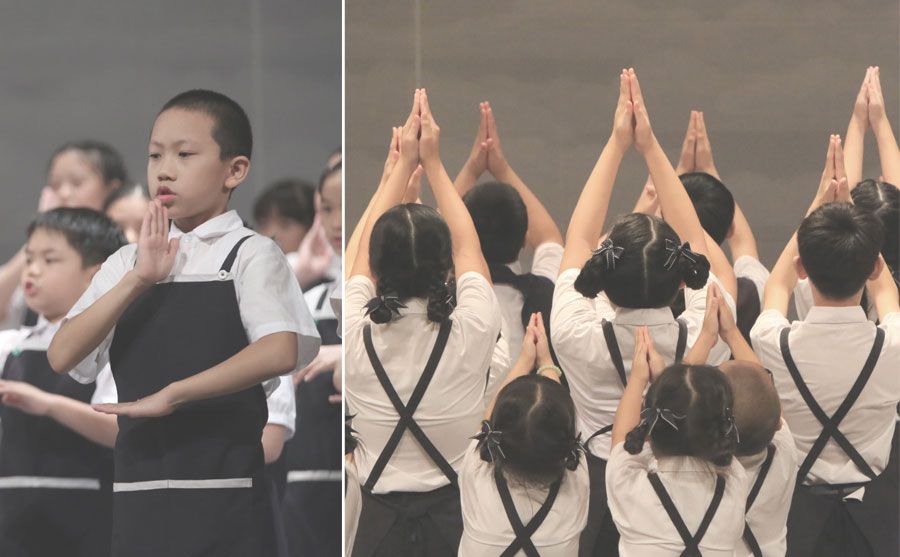 簫聲起,鐘聲響,〈蓮花頌〉婉轉樂聲中,沉靜了大眾的心。舞臺上,緩緩擺動敦煌舞姿的小志工們舉手投足間,猶如一尊尊菩薩化現;突然,樂聲起伏凝重,舞者動作急促,彷彿世間苦難不斷出現,但幸有慈濟志工如同最後的千手觀音般,慈悲膚慰人間苦難。