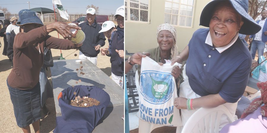慈濟志工向著南非的人說:「平常我們也常接受到了臺灣的愛心米,臺灣來幫助我們;現在臺灣有災難,我們也要學習如何幫助別人。」大家願意響應,即便是零錢,也都是純粹無染的善念。
