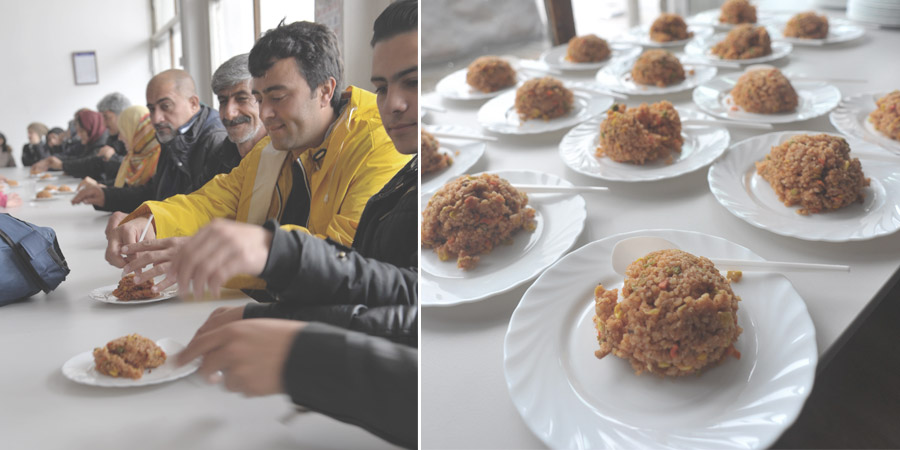 為了能提供難民,一天一餐熱食,慈濟志工當地採買素食調理包,運送到希德難民營和中繼站加熱烹煮,當難民打開餐盒時,看到熱騰騰的一餐,他們都笑了,也知道這分愛,來自臺灣。